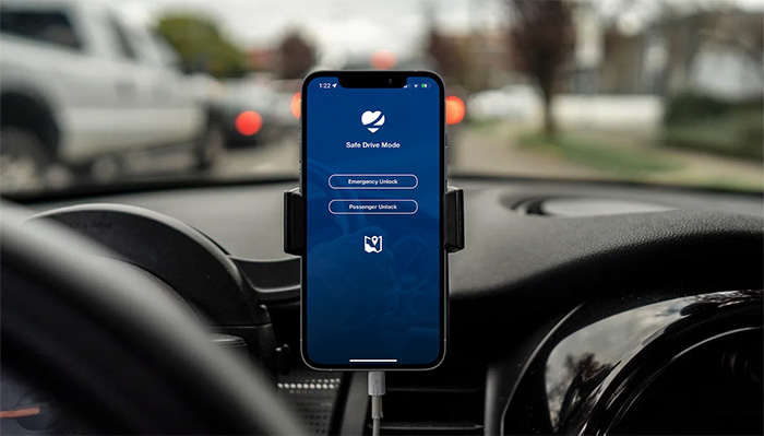 - Automatically blocks phone screen access while driving